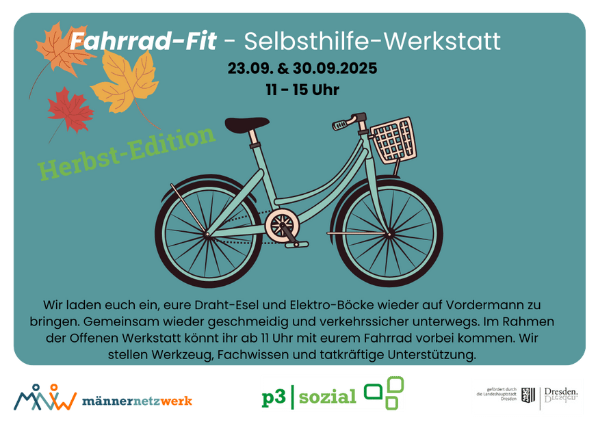 Mit zwei Terminen im September möchten wir einen Blick auf eure Fahrräder werfen und gemeinsam ins Gespräch kommen... Jeden Dienstag gibt es bei p3|sozial, im Bambusübungsraum auf der Schwepnitzer Str. […]