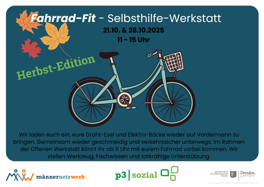 Mit zwei Terminen im September möchten wir einen Blick auf eure Fahrräder werfen und gemeinsam ins Gespräch kommen... Jeden Dienstag gibt es bei p3|sozial, im Bambusübungsraum auf der Schwepnitzer Str. […]